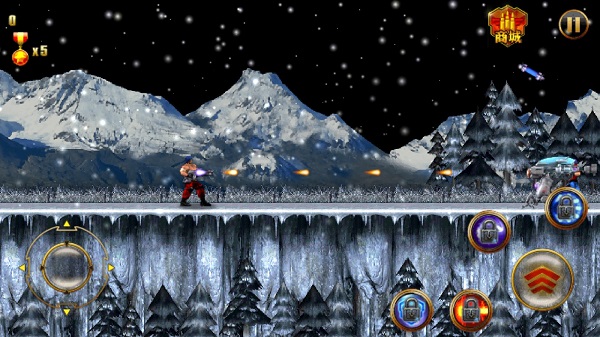 魂斗罗进化革命这关的游戏场景在一片冰天雪地中,这关出现的新兵种--机枪兵(发射子弹的速度奇快),而且这关出现的小兵还会趴下开枪,这无形中增加了游戏的难度,一开始就往前冲,这时雪地里会出现炸弹和机枪兵,在打死机枪兵的同时躲避在身后抛起的炸弹,走到三个断崖的旁边,这时要慢慢走,等后面的三个道具飞过来把最好全部打中,都是有用的,一个S”,一个R”,还有一个是神鹰”,这个时候千万不要向前跳,因为在水里还埋伏着一个向天上放散弹的家伙,等他冒出头时捡神鹰”干掉他,如果有散弹可以轻松地干掉他;跳过三个断崖后,就是两段平坦的大路了,这两段平坦的路上各有一辆大坦克,解决方法很简单:退到屏幕的最左方转头,对着坦克一直开枪,当把它打红时它就会向我们冲过来,不要跑,一直开枪就可以在它冲过来之前把它搞定,搞定两辆大坦克后,再经过一片有炸弹的雪地就来到了关底。