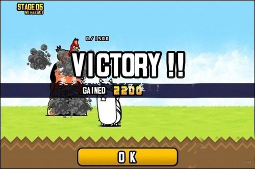 然后正式进入第五关,首先一边出兵抵挡一边将金钱上限提升为四级,注意兵种配合,墙体猫数量一定要比大男子主义猫要多。这样才有胜利的机会。因为敌军的兵种攻击力很强,特别是那个小人”,不依靠墙体猫强大的防御力进行抵挡是很难组织进行反攻的。