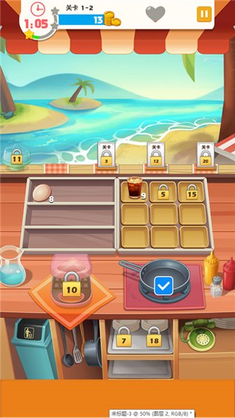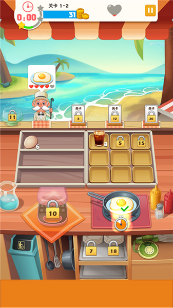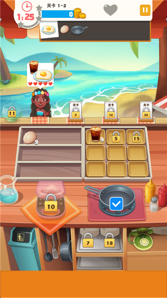2、每一关都有目标,在规定的时间内完成任务。根据客人的需求制作食物,点击鸡蛋-烹饪即可煎蛋。