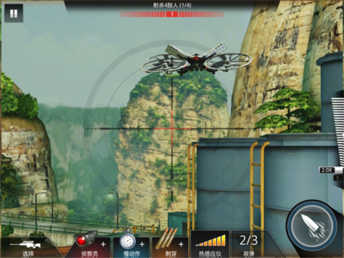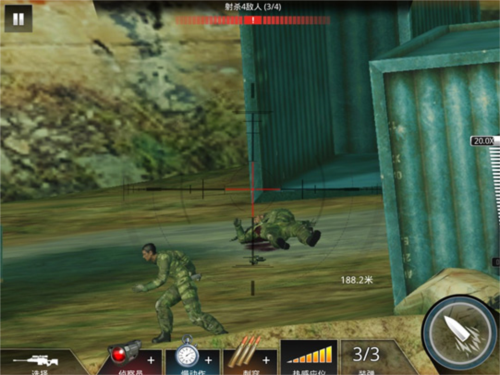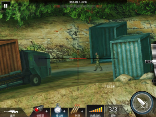 首先,将准星锁定右下角卡车车头附近,等待第一名敌人现身并迅速击毙。紧接着,第二名敌人会前来查看尸体,保持视角不动,趁其靠近时果断开火。随后立即转向右上方,一架敌方战斗机将飞临上空,需快速将其击落。最后,第四名敌人会从原位置逃跑,此时务必把握时机——若担心失手,可先打伤使其减速,或使用【慢动作】道具辅助瞄准。全程强调快、准、稳”,错过关键窗口将导致任务失败。