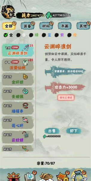 游戏内背包容量最高可升至87级。商店出售的升级材料仅能支持升到77级,剩余10级需通过完成主线任务获得万宝令”,随后在游戏主页的虚天鼎”中兑换引魂灯”道具,方可继续提升容量。达到87级后背包将无法再升级,此时多余的升级材料已无用途,建议直接出售换取资源。