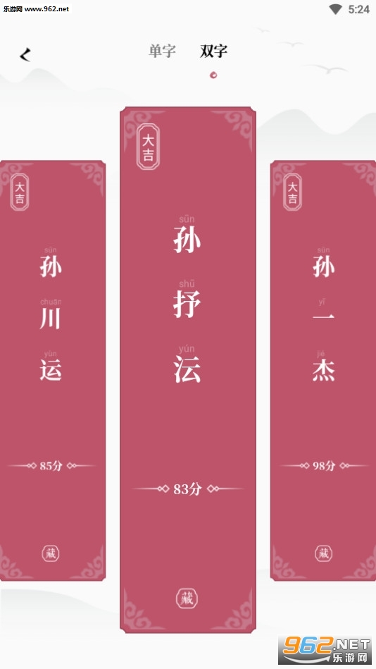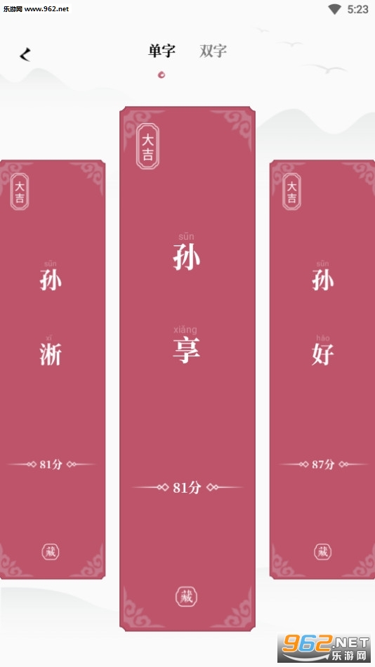 智能滑动筛选:可切换名字签牌的单双字,智能左右滑动自选名字。推荐名字数量无限制,还可获取高分大吉名。