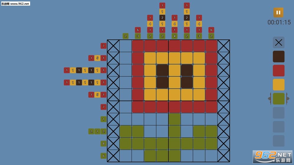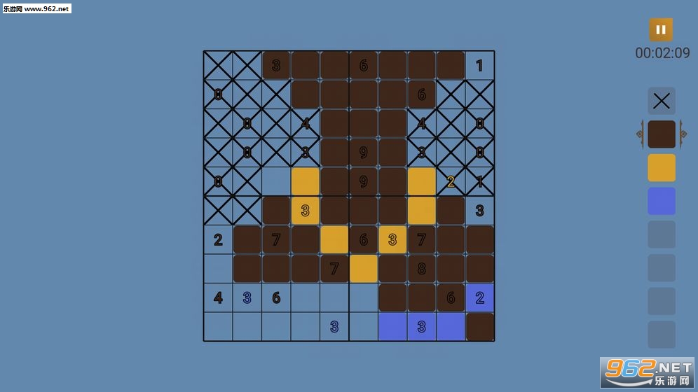 该模式和扫雷游戏比较相似,你要根据线索找出隐藏的方块,每个数字代表周围需要填充多少个单元格,包括其本身。数字出现了点之后,只能说明你有正确的单元格数量,不是说你已经完成正确。多颜色拼图以同样的方式进行,在侧边栏上点击颜色,变化填充颜色。
