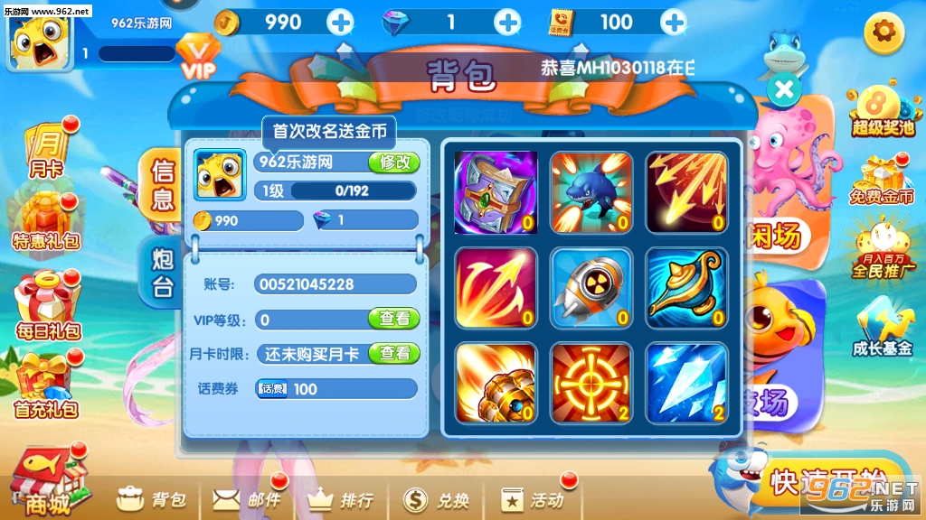 【超多福利】注册就有百万金币,登录就送永久炮台