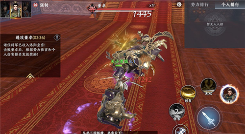 第三关【洛阳皇宫】:全服顶尖势力集结,合力挑战BOSS董卓。根据个人与势力伤害排名发放丰厚奖励,上榜势力还可开启专属拍卖,全员分红。