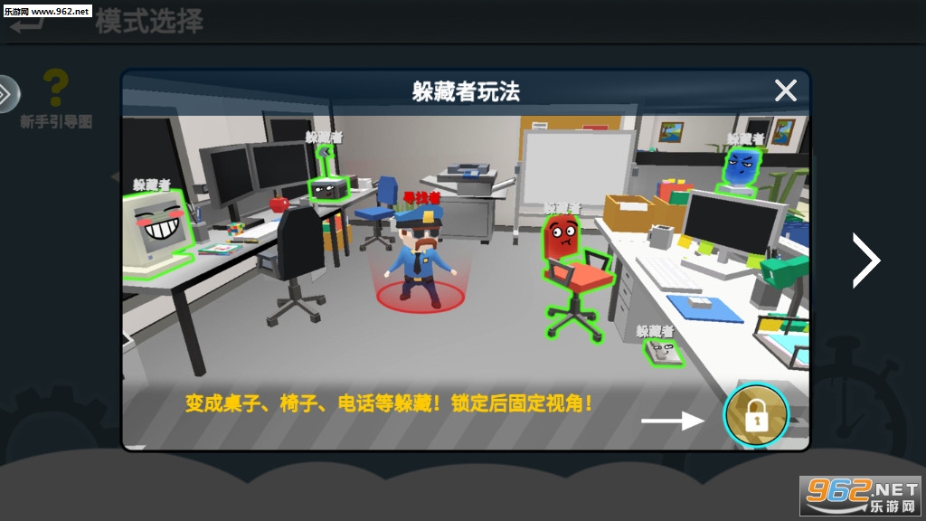 一款3D捉迷藏类休闲游戏。游戏中分为两个阵营:寻找者与躲藏者,躲藏者可以伪装成各种物品,同时可以使用皮弹和3D声音口哨诱导寻找者,寻找者只需在200秒内找到所有躲藏的玩家就可以获得胜利。