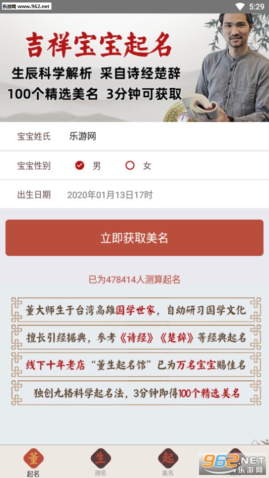 《起名宝宝取名大师app》这是一款权威好用的宝宝取名起名解名类app,它有着强大的取名起名解名功能,许许多多的用户在这里为自己的宝宝取上了一个好名字,它结合楚辞离骚、周易、诗经、五行八卦等等学说,为宝宝选字取名,取一个好名字将不在话下。