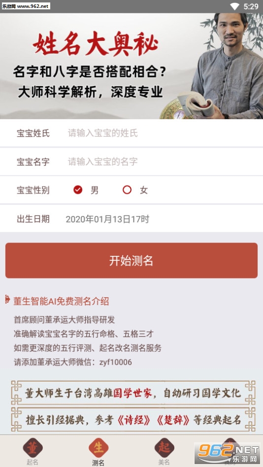 起名宝宝取名大师app是一款起名取名类的手机软件,通过起名宝宝取名大师app你能掌握到更多字词配搭的含意,给小孩一个好的名字。起名宝宝取名大师app是一款专为用户打造的取名字应用。起名宝宝取名大师app这个软件使用的是周易的五行八字优化算法来给宝宝取名字,父母能够加上小宝宝的基础信息,性别、姓氏、起名篇幅、阳历生辰等信息,随后起名宝宝取名大师app依据周一快速为您寻找适合的姓名给您参照,姓名品质都较为高。
