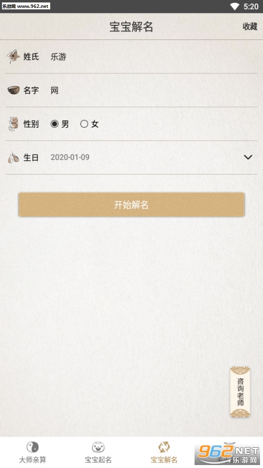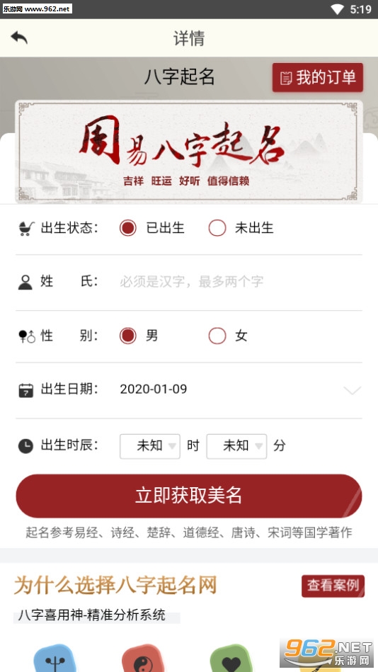输入名字,周易分析和五格评定,辅以生辰八字解析,加上五行研判,名字好坏立刻见分晓!