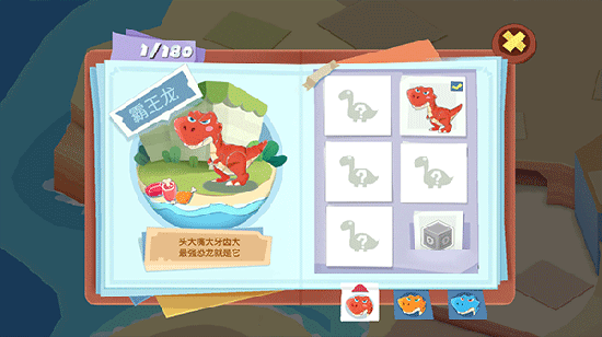 成功完成后,即可获得该恐龙的图鉴碎片。收集足够碎片后,进入骨架拼接环节,通过拖拽、旋转等方式将零散化石还原成完整的恐龙骨架。每完成一只恐龙的复原,就能正式解锁它,加入你的史前伙伴阵容。游戏中包含多种恐龙类型,等待小探险家们不断发现与收集。