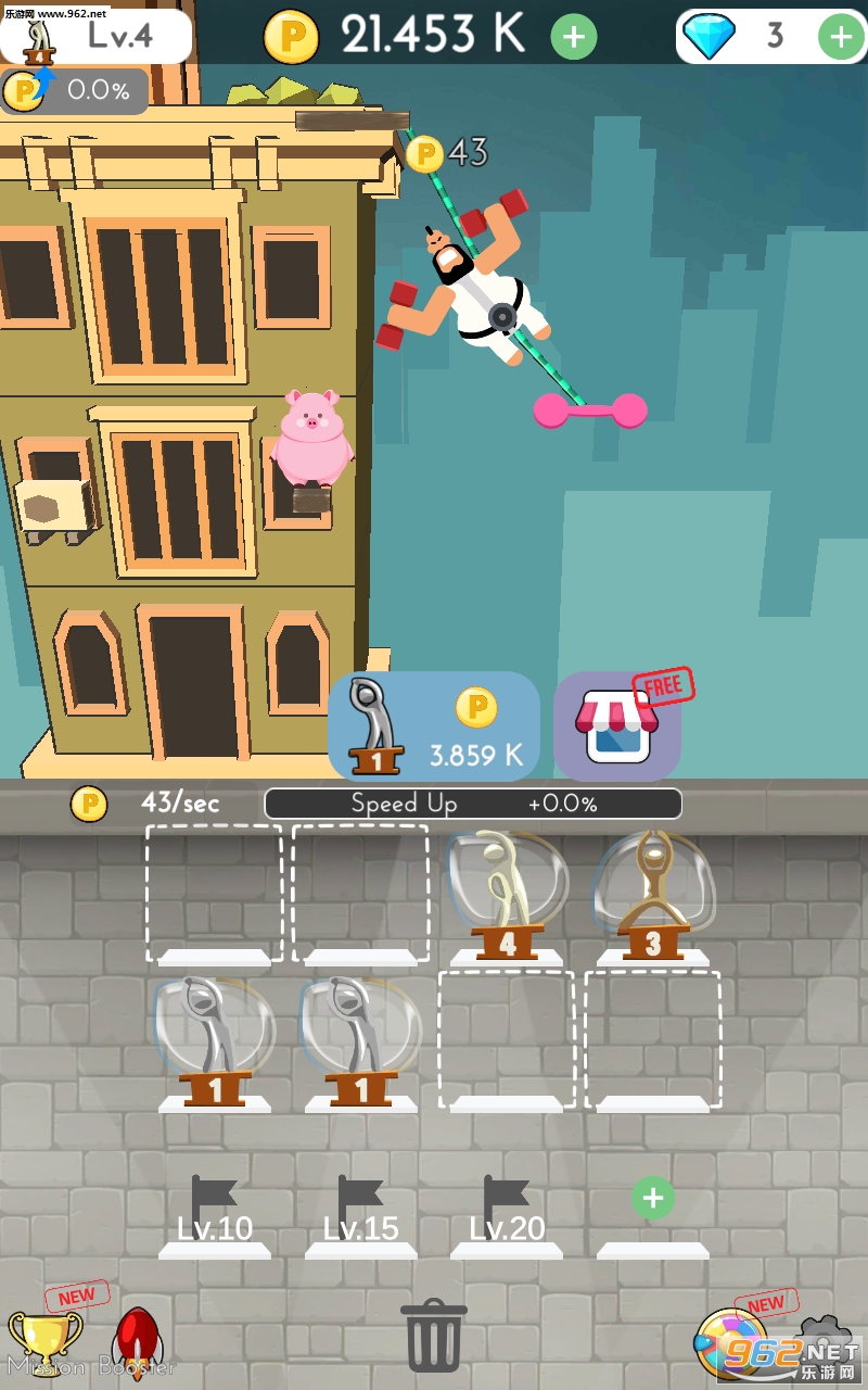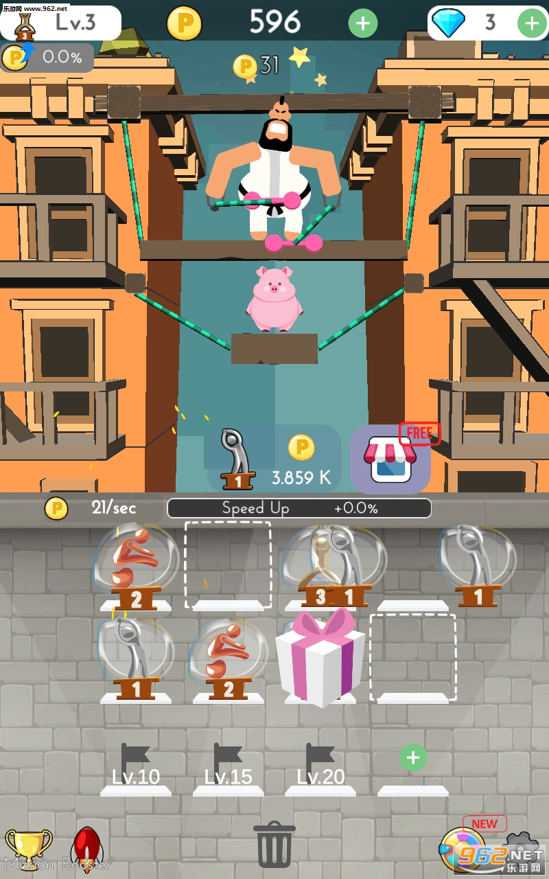 2、玩家要通过不断保持双臂重量相似才能够让大力士不倒,玩家放置的时间越长就能够获得越多的金币。