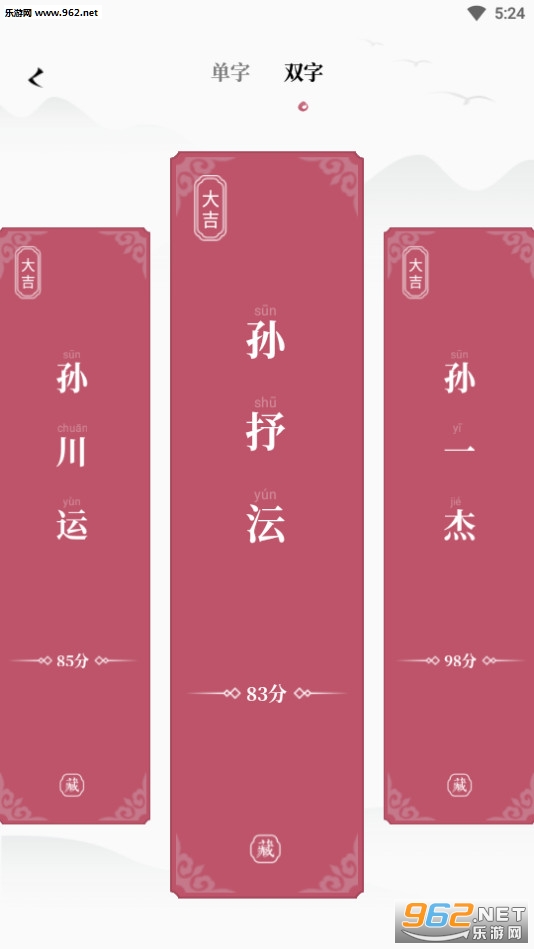 智能滑动筛选:可切换名字签牌的单双字,智能左右滑动自选名字。推荐名字数量无限制,还可获取高分大吉名。