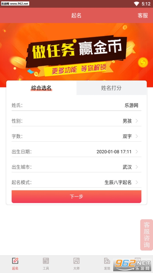 1、无需注册,输入姓氏生辰八字,轻轻松松起好名!