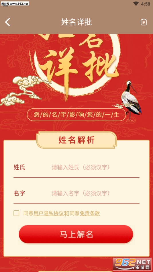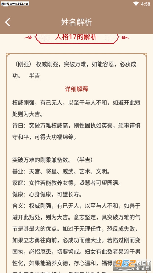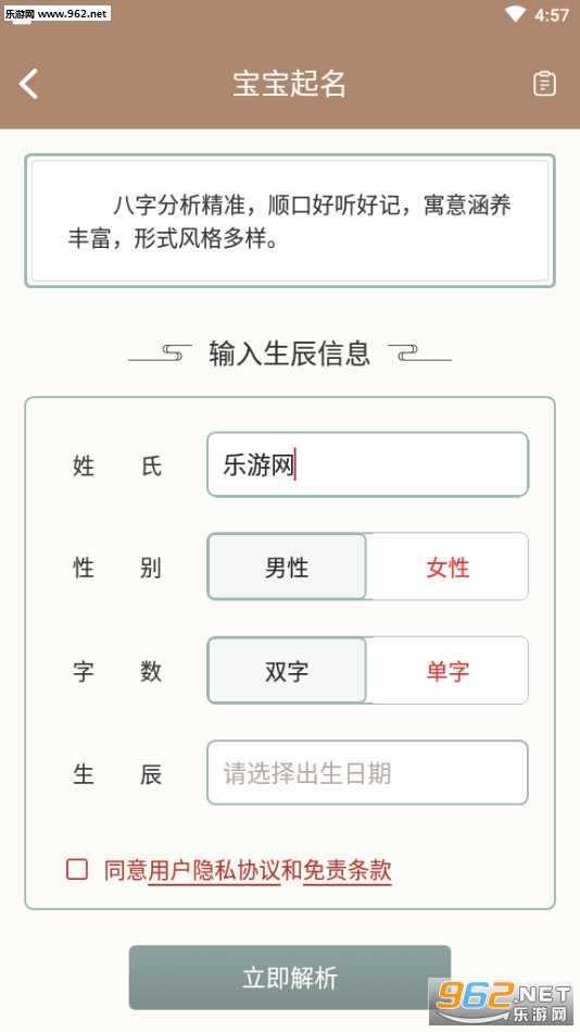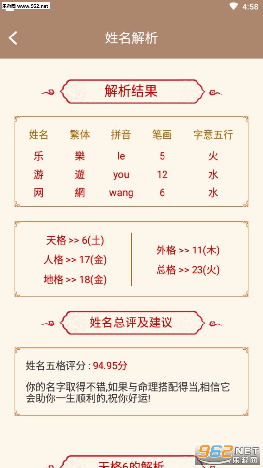 2.起名取名大全软件全面参考《易经》以及近百种中国古代命理解析古籍,五行分析、生辰八字测算、三才五格评分、起名喜用神全面按照传统的古代算法对应标准进行转换,为用户提供姓名解析。