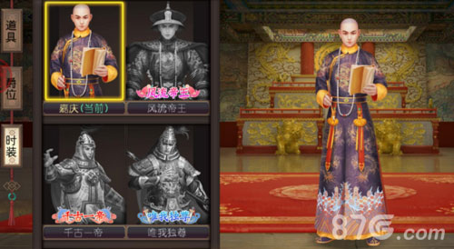 君王形象换装:雍正的勤政务实、乾隆的风流豪迈、嘉庆的儒雅温润……多款帝王时装任你挑选,每套均配专属特效,或霸气、或潇洒、或书卷气十足,彰显天子威仪。