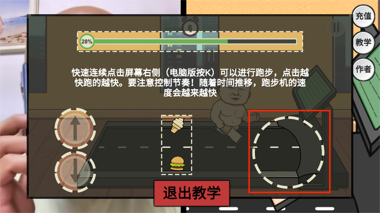 5、左侧的上箭头按钮控制角色往上跑动,以躲避跑步机上的食物。