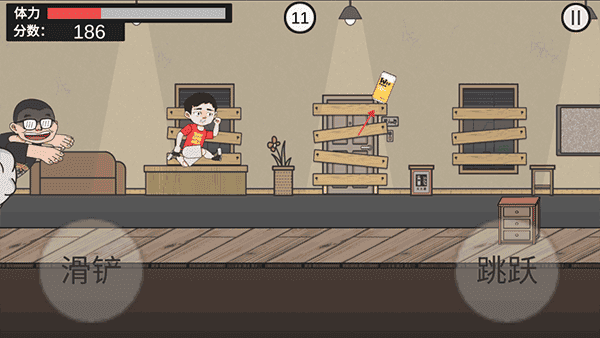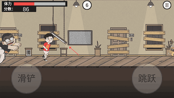 4、点击开始即可开始游戏,左边是滑铲右边是跳跃,玩家需要操控人物躲避杰哥。