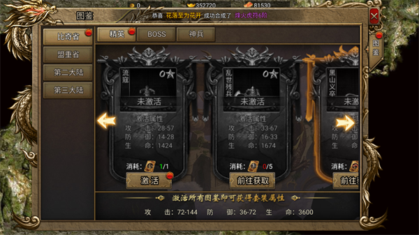 二、图鉴系统:激活即涨战力 通过收集特定道具激活图鉴,可直接提升攻击、防御与生命属性。集齐整套更可解锁强力套装加成。建议新手优先激活流寇”等低门槛图鉴,快速夯实基础战力,为后续BOSS战与阵营PK打下坚实基础。