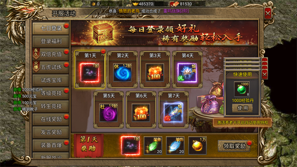 一、开服活动:每日登录领好礼 新号上线第一要务就是完成每日登录任务,首日即可领取1阶攻击宝石等实用道具。同步参与五虎试炼”等级竞技”等限时开服活动,快速积累元宝、经验丹等核心资源,助力角色迅速起飞,抢占先机。