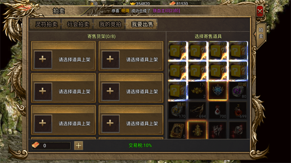 四、拍卖系统:自由交易变现资源 游戏内设低税率(仅10%)拍卖行,支持非绑定道具自由上架寄售。新手可将多余装备或材料出售,换取灵符、元宝等急需资源,再用于购买目标装备,实现资源高效流转与价值最大化。