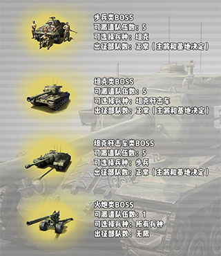 活动中共有4类BOSS,每类对应不同的出征规则。例如挑战坦克歼击车BOSS”时,仅可派出步兵部队;而面对火炮BOSS”则可全员出战。每次挑战无论成败均消耗1次资格(每日限3次),但部队不会因战败而重伤,真正实现零风险高回报。