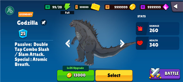 2、游戏中提供丰富的角色阵容,无论是哥斯拉还是金刚,你喜欢的经典角色应有尽有,甚至还有意想不到的隐藏角色等待解锁;