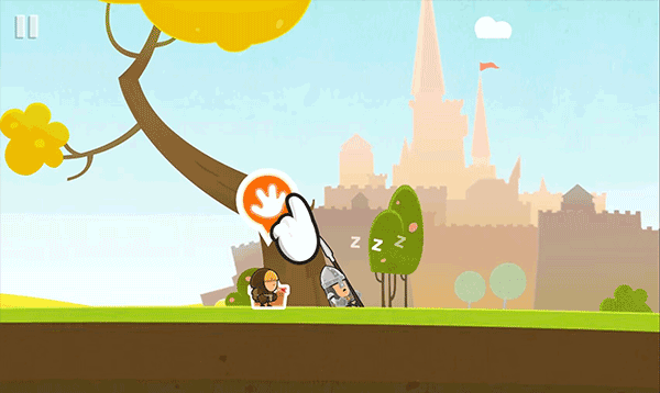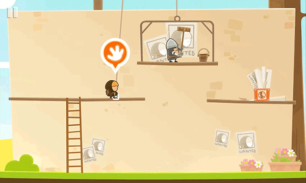 9、移动到图中位置,点击手掌,绳子松开,中间平台掉落。