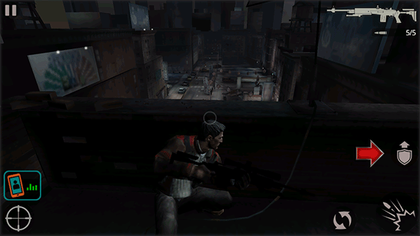 1、下载安装好杀手2影子阴谋手机版,游戏开始我们将身处天台上,并在一个掩护的状态。点击右侧的盾牌箭头图标,主角将站起离开掩护。