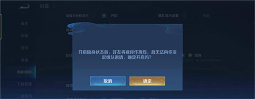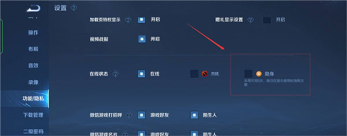 1. 进入游戏大厅,点击右上角【设置】按钮; 2. 在设置中心下滑至【功能/隐私】选项; 3. 找到【在线状态】,选择隐身”即可; 4. 设置成功后,头像框将显示隐身标识,好友无法邀请你参与排位。 注意:隐身功能每周限用5次,请合理使用。