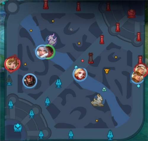 游戏主战场为三路地图(对抗路、中路、射手路),每路由三座防御塔守护,最终目标是摧毁敌方基地水晶。两片丛林穿插其间,分布多种增益怪物:
