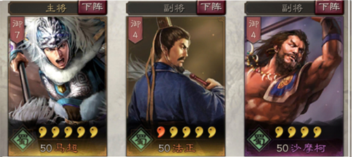- 前期(统御15):马超 + 法正 + 沙摩柯(蜀国加成),攻守均衡,沙摩柯先手控场。