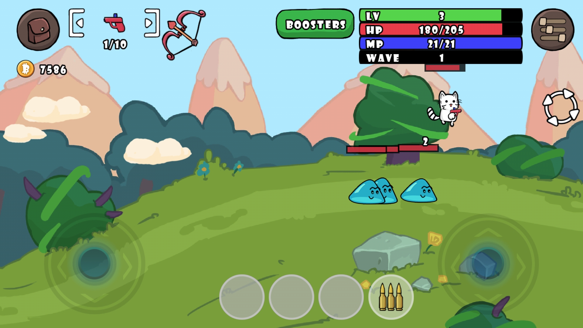 7、进入作战界面,我们可以通过左下方的轮盘控制猫咪移动和跳跃,通过右下方的按钮进行射击,