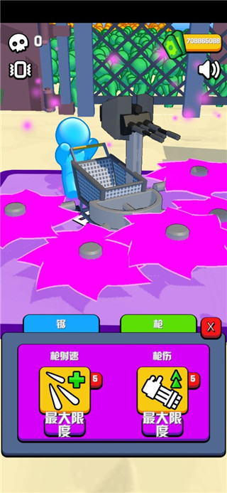 玩家可以在武器库中可以选择锯片、锯质量以及武器,这里我们都可以加到最满,然后选择枪,可以对枪射速、枪伤增加到最大限度,还可以去车库,对加载以及速度进行升级,全部选择完毕之后就可以出去收割僵尸啦,然后可以获取资源,将其存入银行,然后可以解锁新的世界。