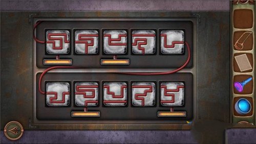 6、滑动每一个模块,让整个线路连通,四个提示灯会亮起来。用锯子将柜子旁边的手柄锯下来,点击这个装置。
