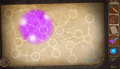 1、点击左边的楼梯(有黄色灯光的地方),我们可以看到一个手电筒,点击右边发蓝光的地方,得到一个镜头,顺便用手电筒蘸一下蓝色的液体。