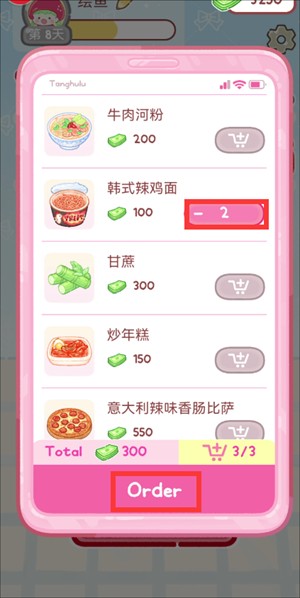 2.在点餐界面选中想要的食物加入购物车,点击Order