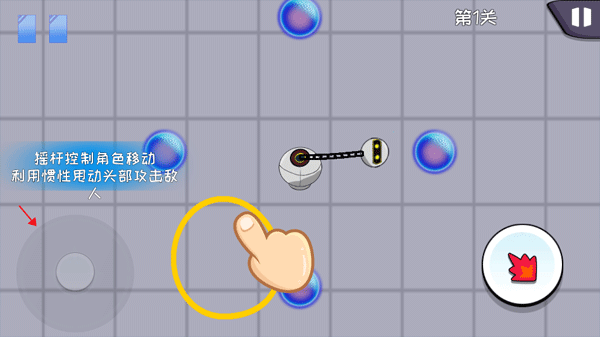 3、这款游戏的玩法分为两种,接下来介绍第一种:就是通过摇杆来控制角色移动,并利用惯性甩动头部攻击敌人,将里面四个敌人全部用头部来攻击完就可以进入下一关。