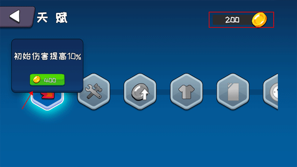 6、现在要介绍的游戏玩法就是游戏主界面左下方的三个功能按钮:强化、皮肤、和芯片。强化可以让机器人的天赋初始伤害值提高10%,不过需要右上角的金币数量达到购买的数值。