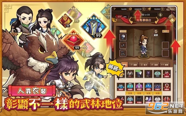 经典武侠剧情改编,上百种令人钦慕的射雕英雄回归,你可以通过任务、活动,逐渐解锁和招募各门各派的高手,培养他们实力资质与好感度,让他们成为你的忠实后盾,与你并肩作战,一同闯荡江湖,创造属于你的武侠传奇。