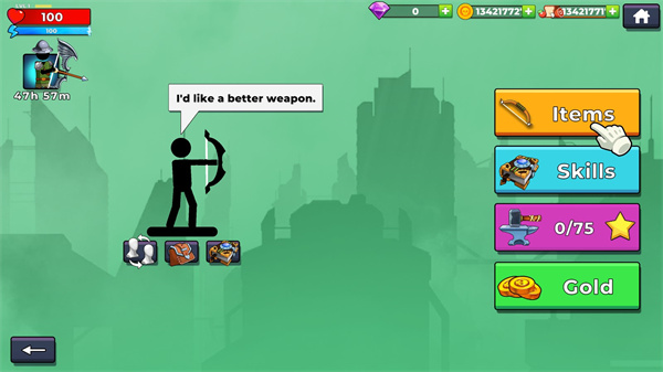首次进入《弓箭手2中文版》,建议优先完成内置的新手教程。点击主界面中的ITEMS”选项,系统将引导你熟悉基础操作与界面布局,助你快速掌握游戏核心玩法。