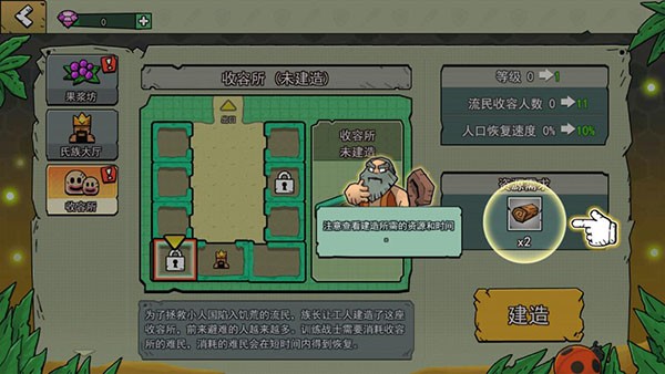 初始建造的收容所会自动吸引饥饿的灾民加入你的族群。为了维持生存,你需要立刻建造果浆坊,为他们提供能量补给。