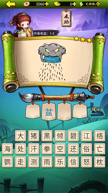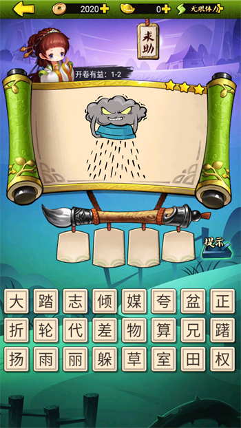 3、根据提示图片,从下方字库中挑选文字,拼出正确成语。
