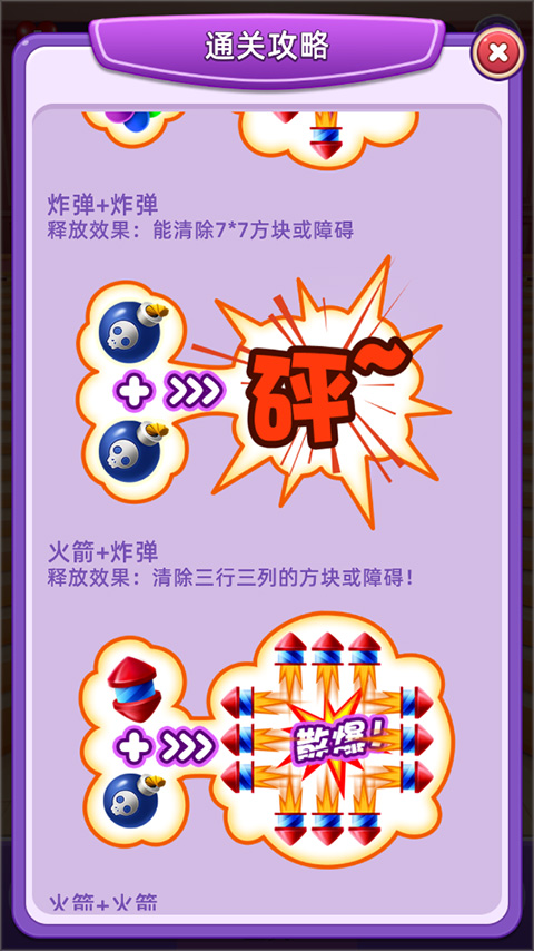 3、炸弹+炸弹 释放效果:能清除7*7方块或障碍 型 火箭+炸弹 释放效果:清除三行三列的方块或障碍!