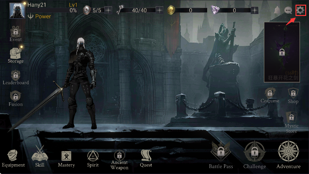 1、进入游戏首页,点击屏幕右上角齿轮设置按钮。