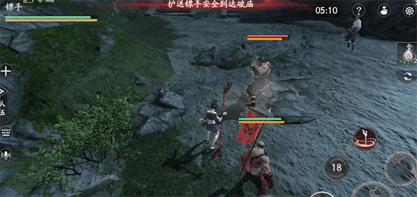 * 在进入关卡前不妨携带战旗”道具,该道具可以回复友方血量,对于一直行走的镖手,玩家可以用角色挡住他前进的道路,即可让镖师一定时间内在战旗回血范围。