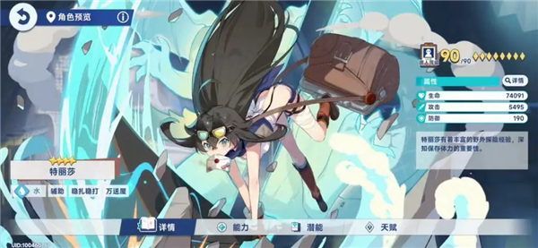 特丽莎(援护|四星) 被誉为“轮椅级”新手神辅,特丽莎集生存与增伤于一体。其援护技能可为全队套上高额护盾(抵挡3次BOSS攻击),点出潜能“我保护你”后更附加免控与抗打断效果,极大缓解千都世站桩输出的压力。同时提供攻速与普攻伤害加成,与苍兰形成完美互补。潜能必点“免控抗打断”“护盾厚度+30%”“攻速增幅+5%”,是水队不可或缺的生存基石。