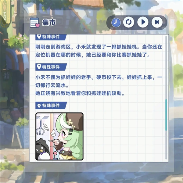 【小禾】 - 集市:逛食品摊 → 参与游戏区活动 → 触发【抓娃娃比赛】 - 港口:前往码头 → 选择夜钓 → 触发【海边垂钓】