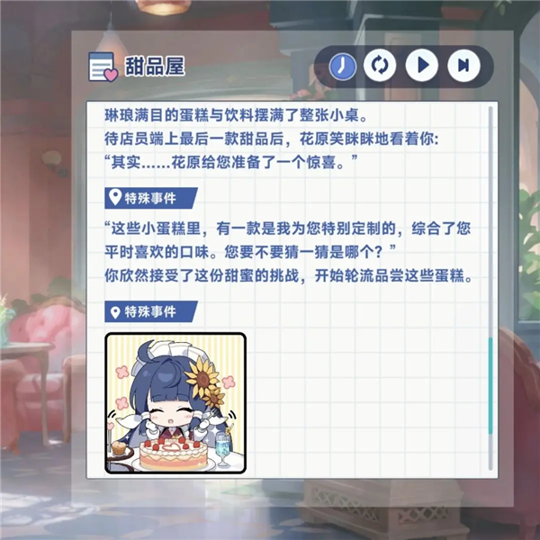 【花原】 - 甜品屋:点蛋糕 → 再点一份 → 触发【定制甜蜜】 - 集市:逛食品摊 → 参与游戏区活动 → 触发【最强助手】