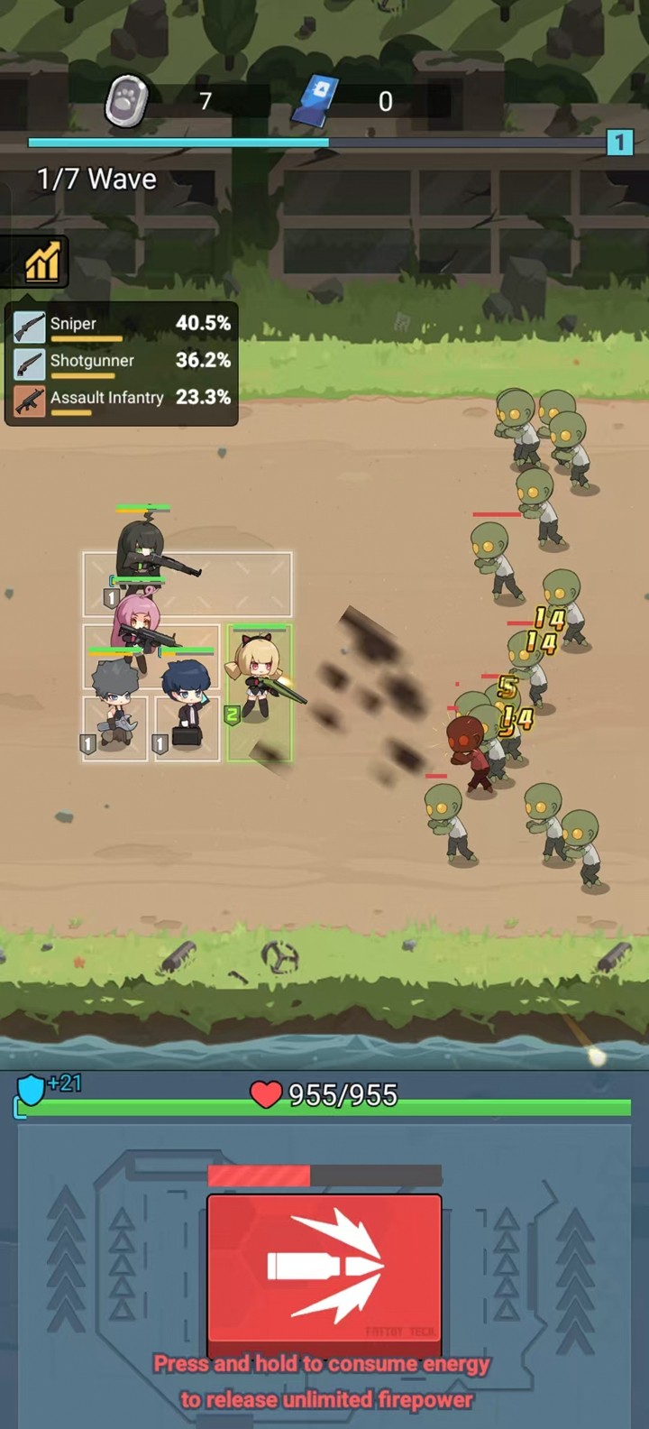1、角色选择与战斗:玩家可以操作多种不同的角色与僵尸对战,每个角色都有独特的武器和技能,如手持冲锋枪的角色可快速扫射敌人,突击步枪手能精确射击,小手枪战士攻击灵活等。角色的攻击方式为自动攻击,玩家也可长按下方的红色子弹图像进行不间断开火。
