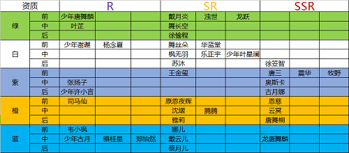 ③、大R:原恩夜辉(橙前)/牧野(紫前),唐三(紫前),徐笠智(白后),舞长空(绿中)/徐愉程(绿后),戴云儿(蓝中)。